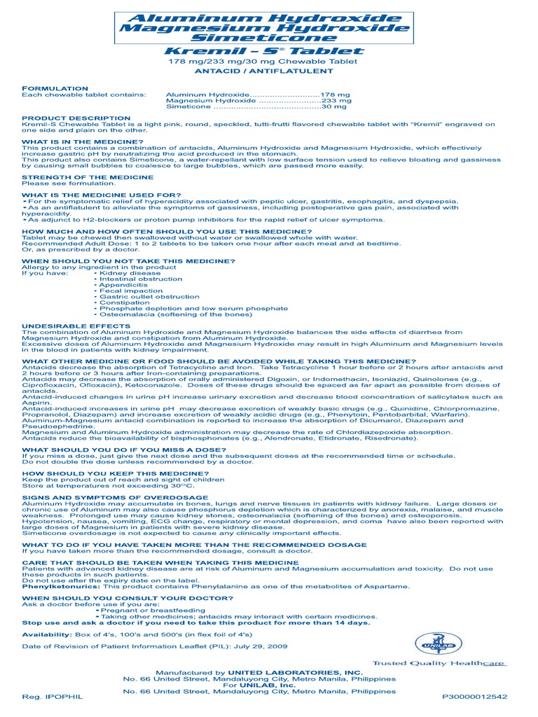 Simeticone is reported as an ingredient of Kremil-S in the following countries. Kremil-SAl hydroxide 178 mg Mg hydroxide 233 mg simeticone 30 mg. Kremil-S Tablet is one such example of an antacid.